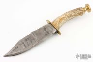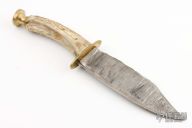 This knife features a hammer marked, etched and fileworked clip point blade with a "rock" finish, .290" blade stock and 1.91" blade depth, hidden tang construction. The handle has a brass guard, and butt, with elk horn grip. Has scuffs and scratches, good condition otherwise.