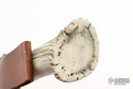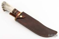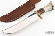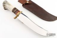 This custom Scagel style Bowie features a mirror polished blade with false top edge, .213" blade stock and 2.087" deep, hidden tang construction. The handle has brass guard, stag and stacked leather handle with black, brass and red spacers, crown stag butt. Comes with a brown leather sheath with belt loop. Excellent condition.