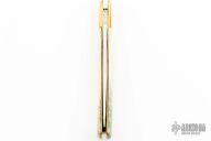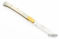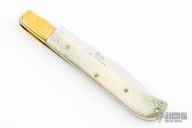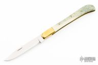 This slipjoint by Craig Barr features a mirror polished blade with nail nick. The handle has brass bolsters, mule deer antler covers, brass liners and steel spring. Has a couple light scratches, otherwise excellent condition.