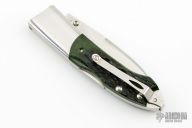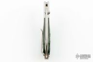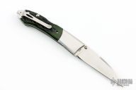 This wharncliffe lockback knife from William Henry features a satin finished VG-10 blade with a false top edge and single thumbstud. The knife has a stainless steel frame and bolsters and jigged bone scales, tip up clip. Has a couple light scratches, otherwise excellent condition.