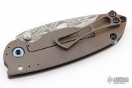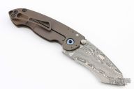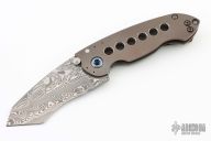 This Solo by Direware features an anodized and bead blasted titanium frame, titanium pocket clip. It also features a Damasteel tanto recurve blade with notched thumbrest and dual thumbstuds. Nice lock up, nice detent and blade seating is dead center. Includes the original box. Excellent Condition.