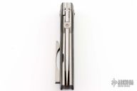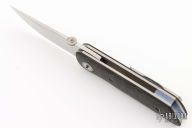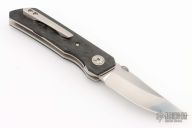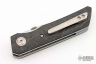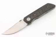This 22X by JVO features a hand rub satin finished blade with a knurled thumbdisc and a swedge. The handle has a marble carbon fiber scales, textured titanium pivot collars, satin finish titanium liners, and orange peel finish tip up clip. Nice detent, lockup and blade seating. Comes with zipper case. Excellent condition.