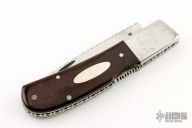 This lockback by Harvey Otis McBurnette features a satin finished blade with nail nick and fileworked spine. The handle has engraved stainless steel bolsters, nickel silver escutcheon, black linen micarta covers, fileworked stainless steel liners and backspacer. Nice lockup, function and blade seating. Has some light scratches, otherwise good condition.