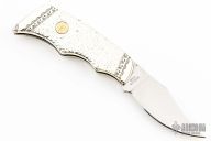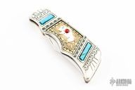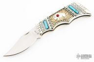 Franklin Mint Navajo Buffalo. Slipjoint knife with turquoise and jasper inlays. Comes with a brown leather sheath. Has a few small chips in the silver coating, otherwise good condition.