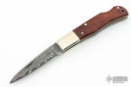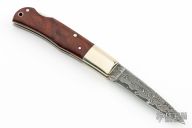 This lockback by AG Russell features a San Mai Damascus blade with nail nick. The handle has nickel silver bolsters and liners and burl wood scales. Has a few light scratches, otherwise excellent condition. #401on the lockbar.