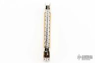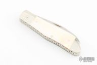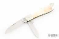 This 2-Blade Slipjoint by Gary Crowder features hand rub satin finished blades with nail nicks. The handle has nickel silver bolsters, gold lip pearl covers, fileworked nickel silver liners, stainless steel springs. Has half-stops. Has some light scratches, otherwise excellent condition.