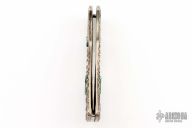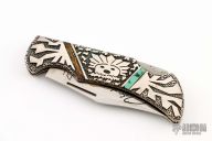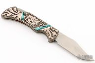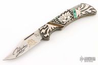 This "Spirit Stalker" folder is a David Yellowhorse Premier Edition by United Cutlery. It features a satin finished clip point blade with swedge and nail nick. The blade is marked with his signature and logo. The handle has a carved sterling silver with turquoise inlays over a steel lock back. Excellent condition.