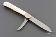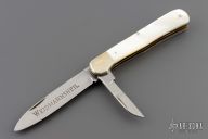 This knife by Weidmannsheil features polished blades with nail nicks. The handle has nickel silver bolsters, mother of pearl covers, brass liners and stainless steel springs. Has some light scratches, otherwise excellent condition. The main blade locks open, push down on the small blade to close.
