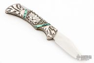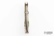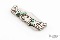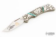 This "Spirit Stalker" folder is a David Yellowhorse Premier Edition by United Cutlery. It features a satin finished clip point blade with swedge and nail nick. The blade is marked with his signature and logo. The handle has a carved sterling silver with turquoise inlays over a steel lock back. Excellent condition. #1278