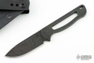 This knife by Pete's Pirate Life features a black stonewashed blade with notched thumbrest, .122" blade stock and .938" blade depth, full tang construction. The handle is skeletonized. Comes with a kydex sheath. Excellent condition.