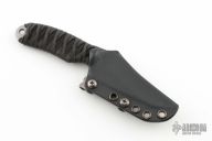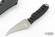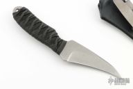 This knife by Joe Watson features a hawk bill stonewashed blade with .128" blade stock and 1.445" blade depth, full tang construction. The handle has black cord wrap over a black cord under wrap. Comes with a kydex sheath. Has a sheathing mark near the tip, otherwise excellent condition.