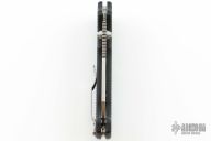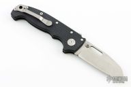 This AD20S by Andrew Demko features a stonewashed shark foot blade with notched thumbrest and dual thumbstuds.   The handle has a Black G-10 frame with a tip up stainless steel clip and "Shark" lock release on the spine. Comes with original box. Excellent condition.