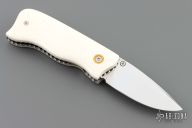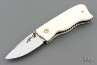 This knife by Suchat Jangtanong features a mirror polished blade with a brass thumbstud. The handle has white bone scales, fileworked stainless steel liners and backspacer. Nice detent, lockup and blade seating. Excellent condition.