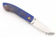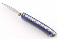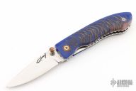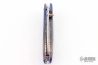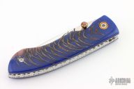 This knife by Suchat Jangtanong features a mirror polished blade with fileworked spine and a brass thumbstud. The handle has pinecone in resin scales, fileworked stainless steel liners and backspacer. Nice detent and lockup. Excellent condition.