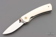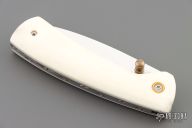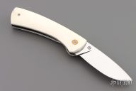 This knife by Suchat Jangtanong features a mirror polished blade with a brass thumbstud. The handle has white bone scales, stainless steel liners and fileworked backspacer. Nice detent and lockup. Excellent condition.