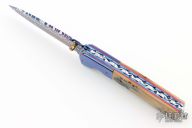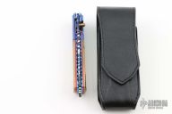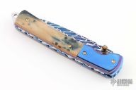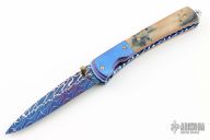 This knife by Suchat Jangtanong features a blued Robert Calcinore Mosaic Damascus blade with a brass thumbstud. The handle has anodized titanium bolsters, mammoth ivory scales with red liners, anodized and fileworked titanium liners and a fileworked stainless steel backspacer. Nice detent, lockup and blade seating. Has a few light scratches, otherwise excellent condition. Comes with a black leather sheath.