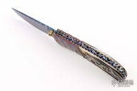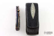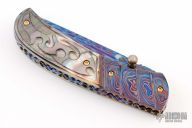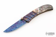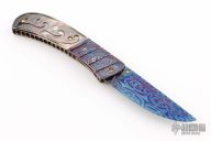 This knife by Suchat Jangtanong features a blued Robert Calcinore Mosaic Damascus blade with a brass thumbstud. The handle has carved matching Damascus bolsters, carved black lip pearl scales with red liners, anodized and fileworked titanium liners and backspacer. Nice detent, lockup and blade seating. Has some rust on the front bolsters where the scale meets the bolster, otherwise good condition. Comes with a stingray skin sheath.