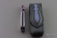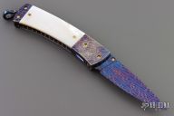 This knife by Suchat Jangtanong features a blued Tony Metsala Mosaic Damascus blade with a mother of pearl inlaid thumbstud. The handle has matching Damascus bolsters, mother of pearl scales, anodized and fileworked titanium liners and backspacer. Nice detent, lockup and blade seating. Has some on the finish of the bolsters, otherwise excellent condition. Comes with a stingray skin inlaid sheath.