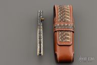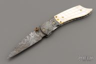 This knife by Suchat Jangtanong features an Alabama Damascus blade with a brass thumbstud and fileworked spine. The handle has matching Damascus bolsters, checkered mother of pearl scales, gold lip pearl band with stone inlays, fileworked stainless steel liners and backspacer. Nice detent, lockup and blade seating. Has some oxidation on the bolsters, otherwise excellent condition. Comes with a snake skin inlaid sheath.