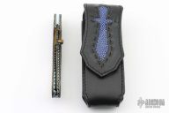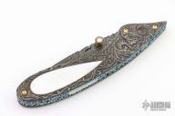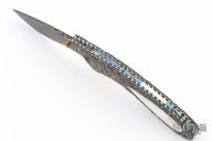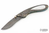 This Linerlock by Suchat Jangtanong features an Alabama Damascus blade with a mother of pearl inlaid thumbstud. The handle has carved Damascus scales with mother of pearl inlays, fileworked and anodized titanium liners and backspacer with mother of pearl inlays. Nice detent and lockup. Comes with a stingray skin inlaid sheath. Excellent condition.