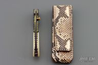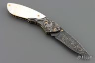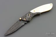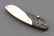 This Linerlock by Suchat Jangtanong features an Alabama Damascus blade with a gold lip pearl inlaid thumbstud. The handle has carved Damascus bolsters, gold lip pearl scales, fileworked and anodized titanium liners and backspacer. Nice detent, blade seating and lockup. Comes with a snake skin sheath. Excellent condition.
