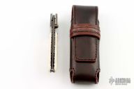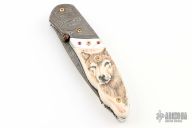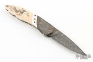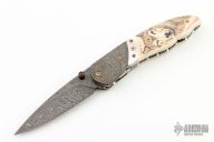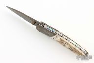 This Linerlock by Suchat Jangtanong features an Alabama Damascus blade with a thumbstud. The handle has Damascus bolsters, scrimshawed bone scales, mother of pearl band with stone inlays, fileworked stainless steel liners and backspacer with abalone inlays. Nice detent, blade seating and lockup. Comes with a brown leather sheath. Excellent condition.