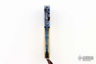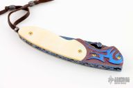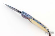 This Linerlock by Suchat Jangtanong features a blued Robert Calcinore Damascus blade with a matching Damascus thumbstud. The handle has carved and anodized titanium bolsters, gold lip pearl scales, fileworked and anodized titanium liners and backspacer. Nice detent, blade seating and lockup. Comes with a brown leather sheath. Excellent condition.