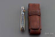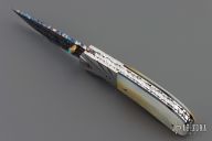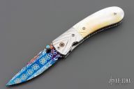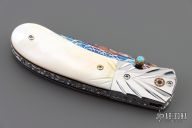 This Linerlock by Suchat Jangtanong features a blued Robert Calcinore Mosaic Damascus blade with a turquoise inlaid thumbstud and a fileworked spine. The handle has carved stainless steel bolsters, gold lip pearl scales, fileworked stainless steel liners and backspacer. Nice detent, blade seating and lockup. Comes with a brown leather sheath. Excellent condition.