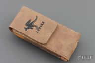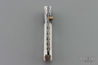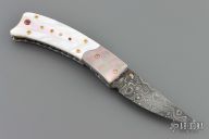 This Linerlock by Suchat Jangtanong features an Alabama Damascus blade with a thumbstud. The handle has black lip pearl bolsters, mother of pearl scales with pink peral and stone inlays, fileworked stainless steel liners and backspacer with mother of pearl inlays. Nice detent, blade seating and lockup. Comes with a brown leather sheath. Excellent condition.
