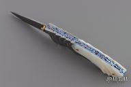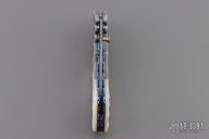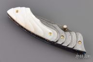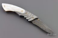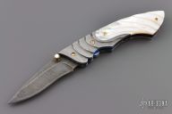 This Linerlock by Suchat Jangtanong features an Alabama Damascus blade with a mother of pearl inlaid thumbstud. The handle has carved Damascus bolsters, carved mother of pearl scales, fileworked and anodized titanium liners and backspacer. Nice detent, blade seating and lockup. Comes with a black leather sheath. Has some light oxidation spots, otherwise excellent condition.