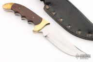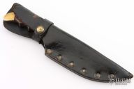 This Ripper from Rigid Knives features an upswept satin finish blade with swedge, .169" blade stock and 1.505" blade depth, full tang construction. The handle has brass bolsters and rosewood scales. Includes leather sheath. Has scratches, has been resharpened, otherwise good user condition.