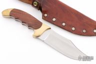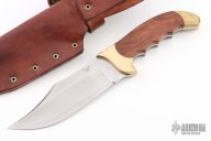 This Razorback from Rigid Knives features a satin finished blade with a false top edge, .150" blade stock and 1.755" blade depth, full tang construction. The handle is comprised of brass guard and pommel with rosewood scales. Comes with a brown leather sheath. Has some light scratches, otherwise excellent condition.