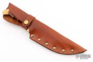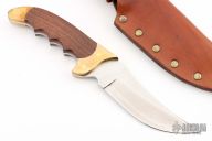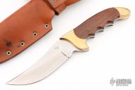 This Ripper from Rigid Knives features an upswept satin finish blade with swedge, .149" blade stock and 1.523" blade depth, full tang construction. The handle has brass bolsters and rosewood scales. Includes leather sheath. Excellent condition.