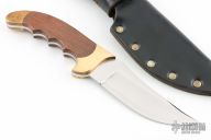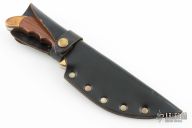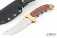 This Ripper from Rigid Knives features an upswept satin finish blade with swedge, .162" blade stock and 1.578" blade depth, full tang construction. The handle has brass bolsters and rosewood scales. Includes leather sheath. Excellent condition. Has "57 67 81" on the ricasso