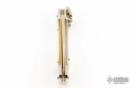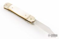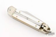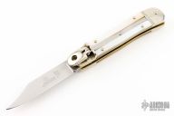 This leverlock auto by Hubertus features a mirror polished blade, nickel silver double bolsters, mother of pearl scales, brass liners and pins. Opens with a nice snap. Very fast opening. Excellent condition. Comes with a nylon velcro case.