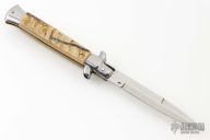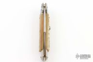 This Swivel Bolster features a stonewashed bayonet ground blade. The handle has stainless steel bolsters and pommel with sheep horn scales over brass liners and stainless steel backspacer. Excellent Condition.