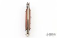 This Swivel Bolster features a stonewashed bayonet ground blade. The handle has stainless steel bolsters and pommel with dymondwood scales over brass liners and stainless steel backspacer. Excellent Condition.
