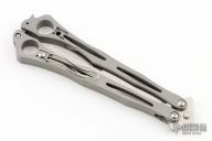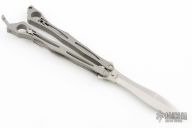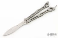 This Spyderfly Balisong by Spyderco features a satin finished spear point VG-10 blade with a false top edge. The handles are bead blasted stainless steel with a tip up clip (4-way reversible). Has a couple light scuffs, otherwise excellent condition. Comes with original box. #006
