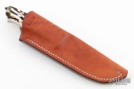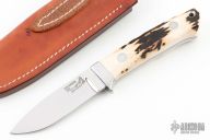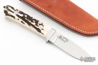 The classic Drop Point Hunter that made Bob Loveless designs so famous. Mirror finished drop point blade with the "R.W. Loveless maker Riverside, Calif." Double Nude logo. Full tapered tang construction. .164" Blade Stock .975" Blade Depth. The handle has a stainless steel guard and stag scales with red liners, lanyard hole. #189. Comes with matching numbered leather sheath. Has a couple very light scratches, otherwise excellent condition.