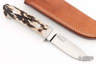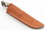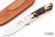 The classic Drop Point Hunter that made Bob Loveless designs so famous. Mirror finished drop point blade with the "R.W. Loveless maker Riverside, Calif." Double Nude logo. Full tapered tang construction. .169" Blade Stock .953" Blade Depth. The handle has a stainless steel guard and stag scales with red liners, lanyard hole. #175. Comes with matching numbered leather sheath. Has a couple very light scratches, otherwise excellent condition.