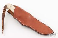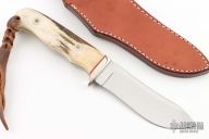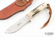 This knife from Rigid Knives features mirror finished blade, .148" blade stock and 1.199" blade depth, full tapered tang construction. The handle has a nickel silver guard with stag scales over red liners. Comes with original brown leather sheath. Has some light scratches, otherwise excellent condition.
