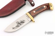 This Hunter from Rigid Knives features a satin finish blade with swedge, .143" blade stock and 1.570" blade depth, full tang construction. The handle has brass bolsters and dymondwood scales. Includes leather sheath. Excellent condition.