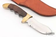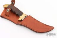This knife from Rigid Knives features a satin finish blade with swedge, .175" blade stock and 1.438" blade depth, full tang construction. The handle has brass bolsters and rosewood scales. Includes leather sheath. Has some scratches and pitting, otherwise good user condition.