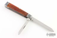 This slipjoint by Tony Huffman features hand rub satin finished blades with nail nicks. The handle has engraved dovetailed stainless steel bolsters, engraved by Bruce Shaw, jigged bone covers, stainless steel escutcheon, stainless steel liners and springs. Has half-stops. Has some light scratches, otherwise excellent condition. Comes with a zippered case.
