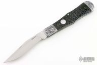 This Slipjoint by Joe Knipstein features a hand rub satin finished blade with nail nick. The handle has engraved stainless steel bolsters with integral liners, stainless steel spring, stainless steel escutcheon, jigged bone covers. #002 on blade. Has a couple light scratches, otherwise excellent condition. Engraving done by Bruce Shaw. Comes with a zippered case.