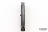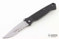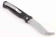 This Vallotton Chameleon D/A by Timberline Knives has a bead blasted partially serrated blade with dual thumb studs and notched thumbrest. Handle is black FRN composite scales with rubber inlay, stainless steel liners and tip up clip. Has some light scratches, otherwise excellent condition. Comes with a nylon belt sheath. The hidden button is under the front rubber scale.
