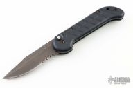 This Ox Enterprises / Charles Ochs coil-spring automatic features a black partially serrated blade and black anodized aluminum frame. Strong and fast opening. Nice function. Has a couple light scuffs, excellent conditon otherwise. Comes with original box and card.
