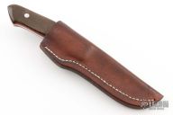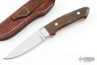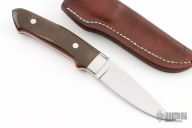 This knife by Patrick Harp features a mirror polished blade with .174" blade stock and 1.017" blade depth, full tapered tang construction. The handle has stainless steel bolsters, green canvas micarta scales with red liners. Comes with a brown leather sheath dated 2021. Excellent condition.