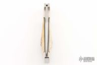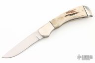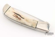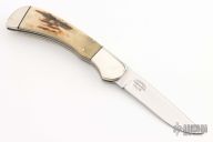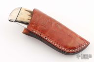 This Bolster Release Auto by Tommy Ware features a satin finished blade. The handle has nickel silver bolsters, liners and stainless steel backspacer with stag scales. Comes with a brown leather belt sheath. Has a few light scratches, otherwise excellent condition. Dated 1996