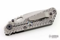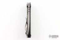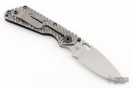 This SNG DGG by Strider has a stonewash spear point blade with dual thumb studs, thumb hole, and notched thumb rest. Handle is black G-10 and bead blasted titanium "Gunner Grip", it is missing the lockbar stabilizer, and anodized titanium tip up clip. Nice detent, lockup and blade seating. Excellent condition.